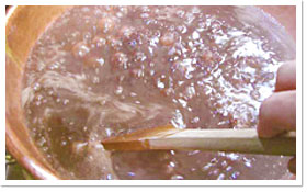小豆を圧力釜にて炊き上げ、砂糖蜜に浸けて一晩休ませ、翌日小豆にしっかりと糖が浸透してから粒を壊さないように優しく手煉りで煉り上げますので、煉るのに2日間掛かります。更に一晩、熱を抜いて冷蔵庫にて締めないと使えませんので、最終的には3日間必要になります。